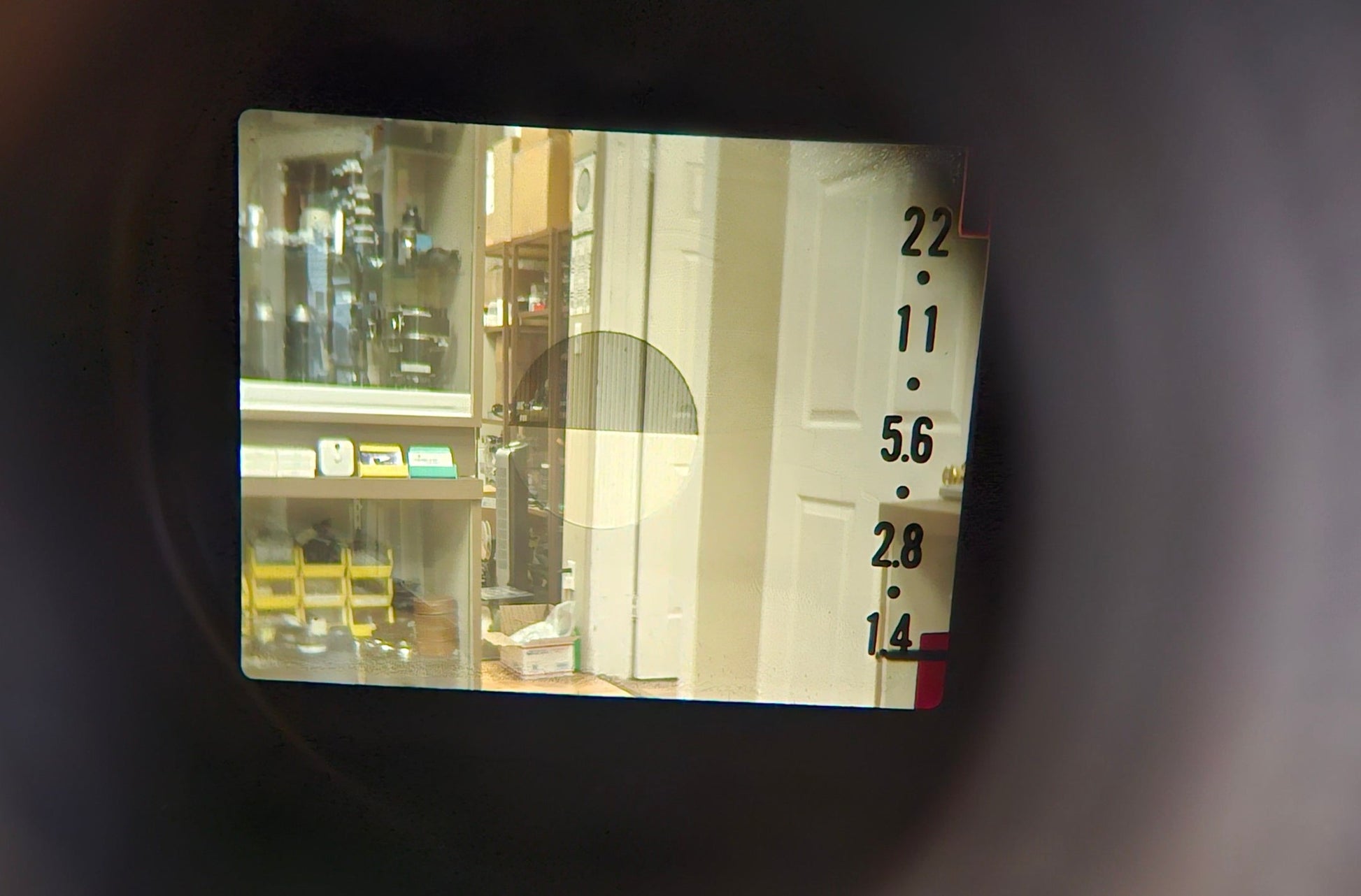 viewfinder information: aperture value, exposure meter needle, over/under exposure warnings, manual aperture mark