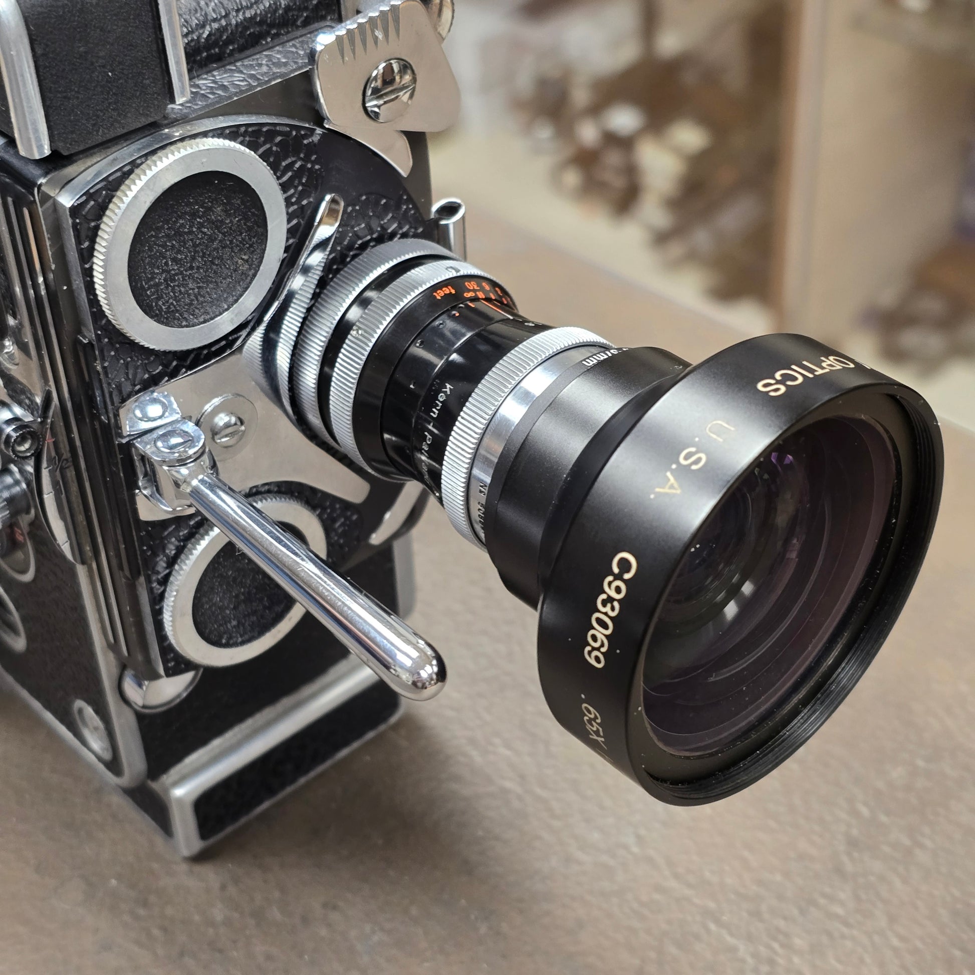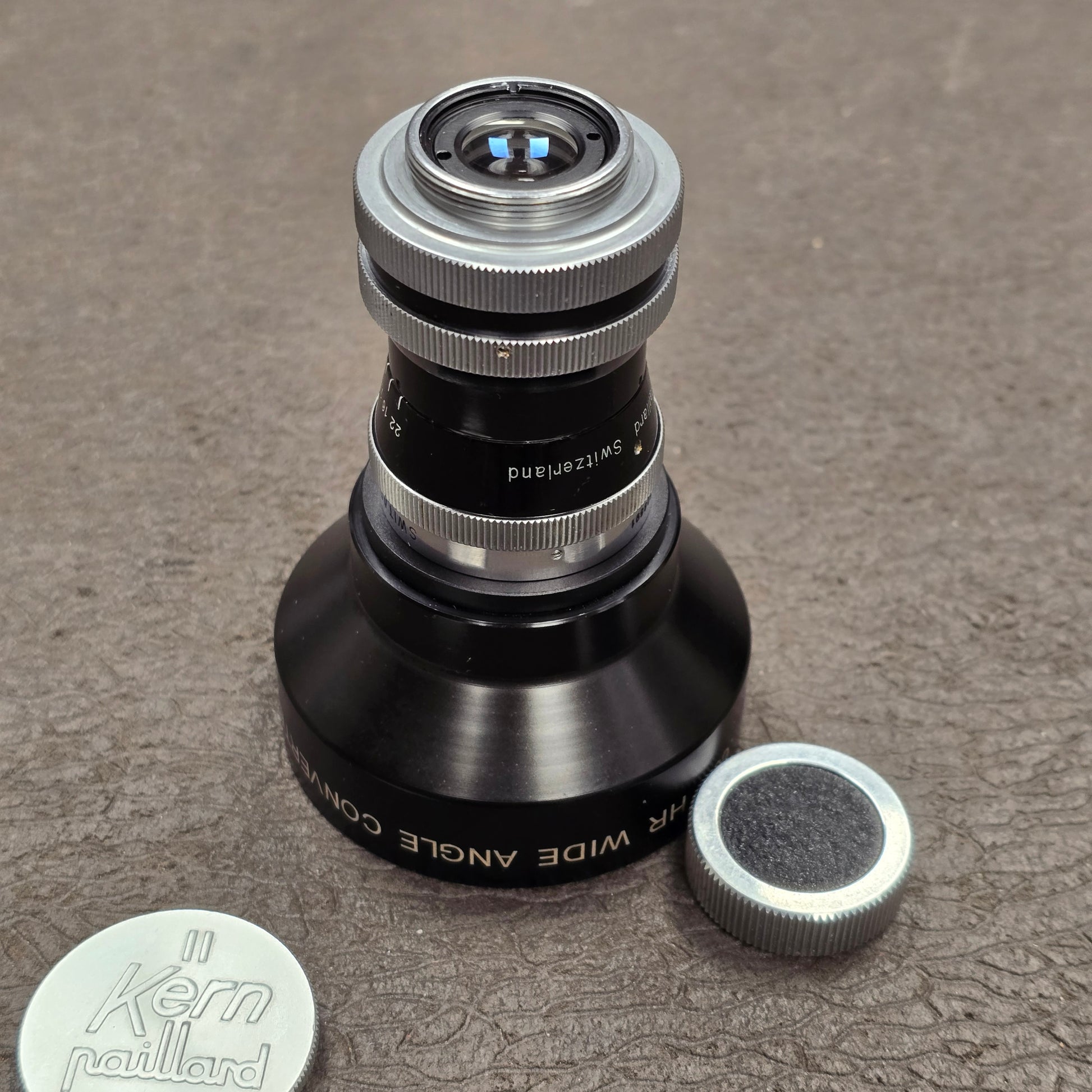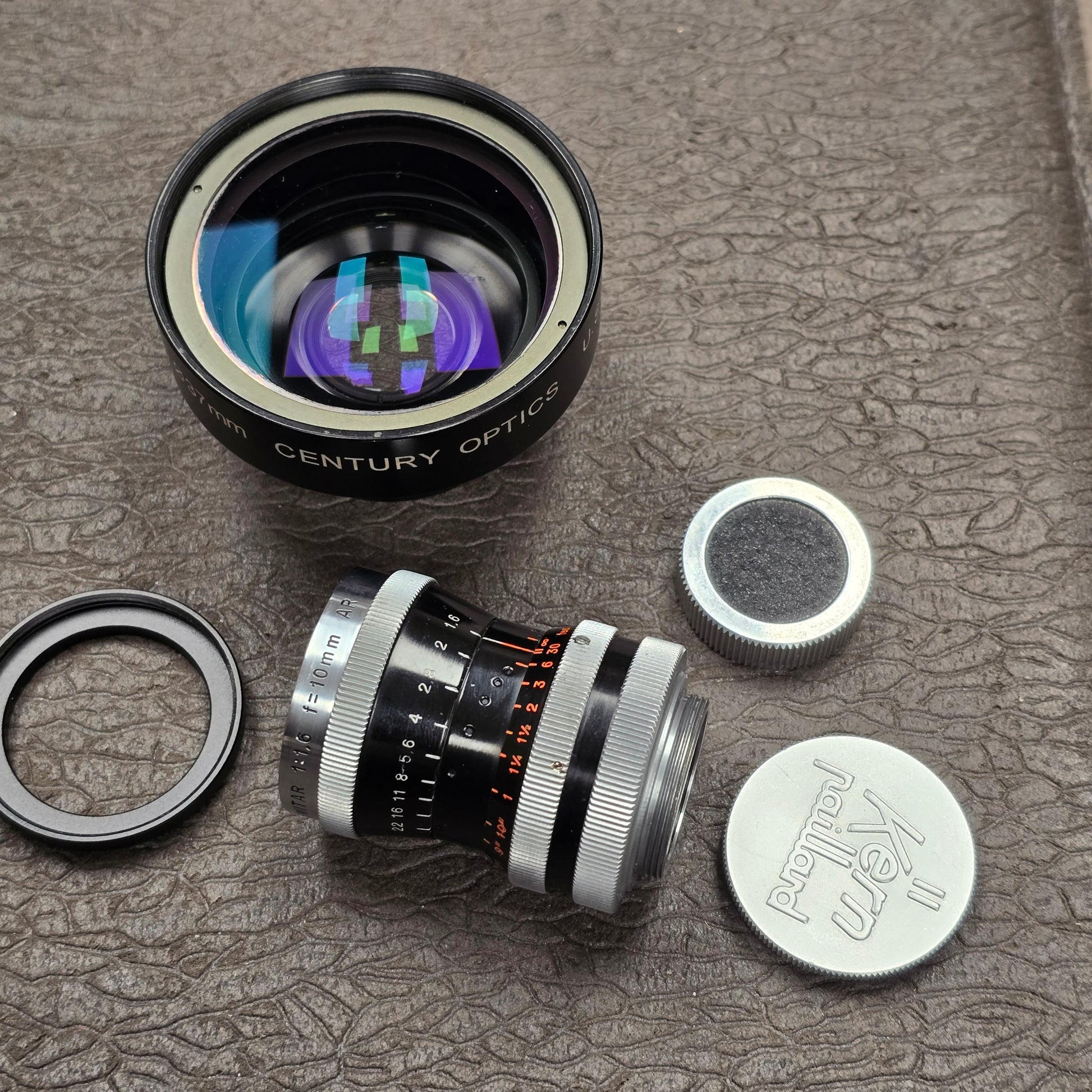 Switar 10mm f1.6 AR C-Mount Lens S# 508691 with Century Optics .65x HR Wide Angle Converter S# C93069