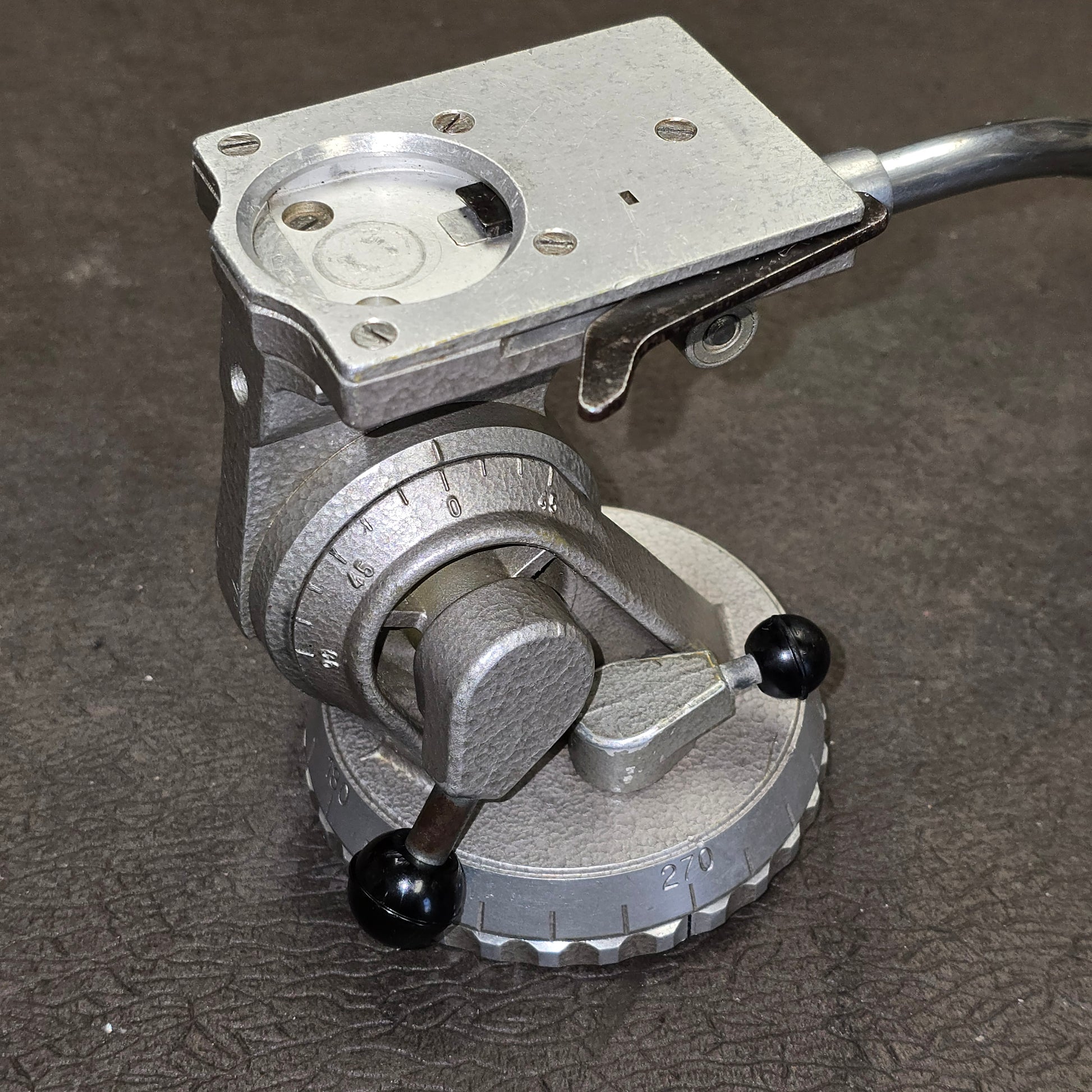 The head contains a built-in spirit level and allows 360 degree panning and 135 degree tilt, with an engraved degree scale. A pan-handle was available to accomodate a 21" cable release and could be adjusted for left or right handed use.